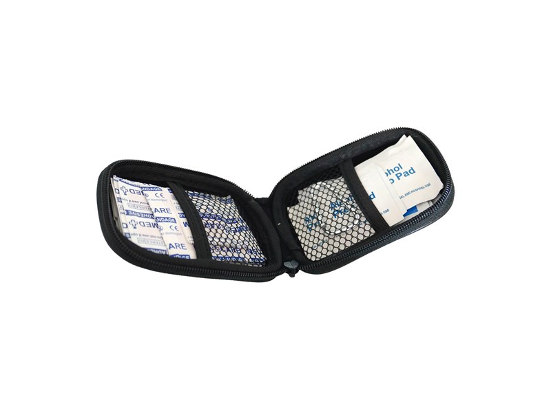 Die Mini Apotheke enthält 27 hautfreundliche Pflaster in verschiedenen Grössen, sowie zwei Reinigungstücher, sechs Alkoholpads und ein Nonwoven-Pad sowie einen Karabiner-Haken.