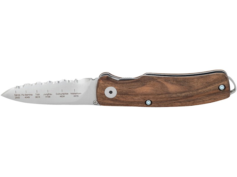 Gefertigt wird das Maloja-Messer in einem traditionellem Verfahren, aus hochwertigem, ultraharten Böhler‘ Chromstahl N690, Härte 59-60 HRC, der nach Feinschliff und Finishing ultrascharfe Schneideeigenschaften garantiert. Weiteres cleveres Detail ist der "Liner-Lock": Er sorgt durch Einrasten der Klinge für die notwendige Sicherheit bei der Handhabung. Zur optischen Vollendung bekam Marcos Messer einen zu Wald, Wind und Wetter passenden Look: witterungsfester Nussbaum für einen guten Griff.