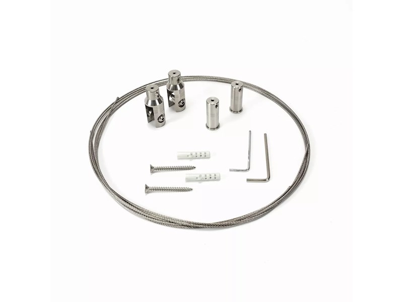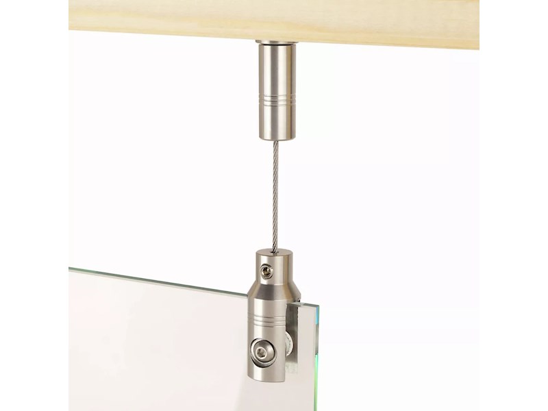 Zunächst montieren Sie den Gewindering mit der beiliegenden Senkkopfschraube an der Decke. Anschliessend schrauben Sie den Deckenhalter auf den Ring und sichern das 1,5 mm starke Stahlseil mit einer Madenschraube an den Deckenhalter. Nachdem Sie die gewünschte Länge ermittelt haben, kürzen Sie das Seil und sichern es am Plattenhalter mit einer seitlichen Madenschraube. Das vorgebohrte Schild wird ebenfalls mit einer seitlichen Schraube gesichert.